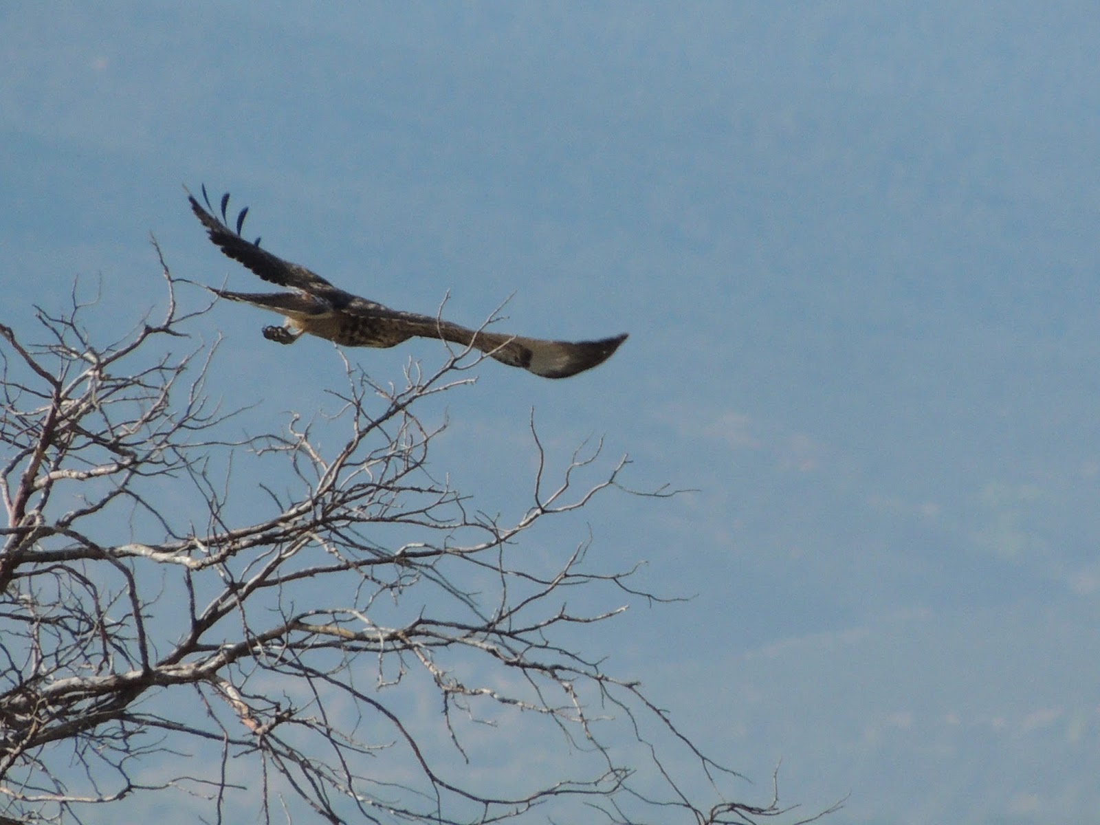 Some time after they left late yesterday, I went outside with my camera to try to get a shot of something entirely unrelated to the images here. While walking to the southwest, I caught a glimpse of a pair of large and powerful wings taking off from the field — just a glimpse; no more than an impression, really. It could have been a very large raven, or it could have been the ferruginous hawk who has begun to visit. I followed along my line of sight, hoping to find where he landed; it was a raptor, and he had perched atop my gnarled and twisted little tree at the south fence. I began shooting (at a very great distance, full zoom), and got off four halfway-decent shots before he took flight again. I went inside happy to have a few new shots of the being I've taken to calling Uncle Ferruginous.